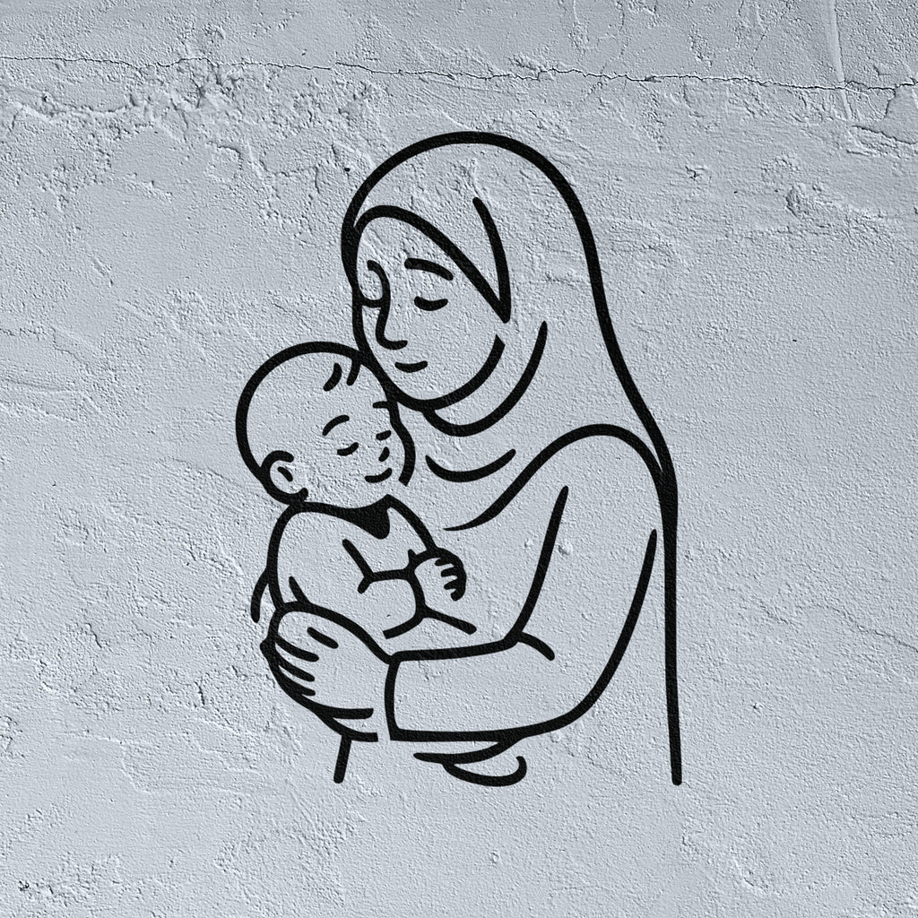 This stencil art captures a tender moment of a mother holding her baby in a sleek, minimalist line art style. Perfect for creative projects or home decor, it highlights the beauty of maternal love with elegant simplicity.